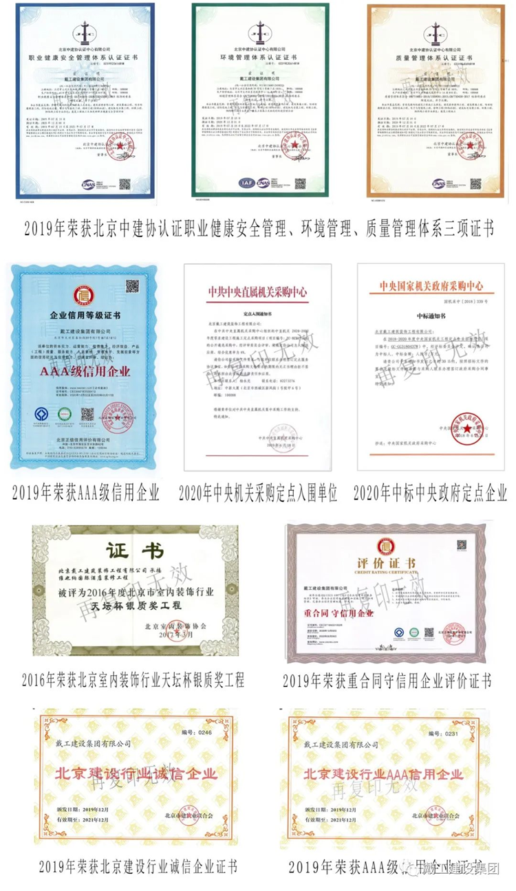 戴工建設集團有限公司系一家集裝飾設計、工程施工、材料配送、木門、地板、家具、 裝飾品開發為一體的裝飾企業。公司位于北京市大興區。具有建委頒發的建筑裝飾裝修專業 壹級、防水保溫工程專業壹級、建筑幕墻專業貳級、消防設施專業貳級、電子與智能化專業 貳級,特種工程(結構補強)專業不分等級、建筑機電安裝專業叁級、環保工程專業叁級、 鋼結構專業叁級、建筑工程總承包叁級、建筑裝飾工程設計專項乙級、中國展覽館協會展覽 陳列工程設計與施工一體化壹級資質和中國展覽館協會展覽工程企業資質。公司通過了GB/T19001,IS014001,GB/T/OHSAS 認證。主要從事辦公空間、餐飲酒店、商業空間、學校、 醫院、別墅、住宅等場所的裝修設計和施工。公司經北京市工商管理局正式批準注冊、北京市建委審核認定,已取得國家正規資質, 為中國建筑裝飾協會、中國室內裝飾協會、北京室內裝飾協會、北京市建筑裝飾協會的會員 單位,誠信五星級單位、質量 AAA 級單位。多年來公司持續穩步發展,下設財務部、綜合管理部、工程質量部、市場開發部、經營 部、設計部和合同預算部七個部門。建立了從方案設計、工程施工、質量監督到售后服務等 一整套細致合理的服務流程體系。由經驗豐富、時尚創新的設計精英;正規培訓、技藝嫻熟 的南方技工;資深專業的管理人員共同組建成一支誠信、敬業、務實、創新的精英團隊。先 進的辦公及施工、檢測設備;人文、科學的企業管理模式,為工程質量和公司發展提供了有 力的保障。公司以先進的設計理念、精深的設計功底為先導,以規范的管理、精湛的施工技術為基 礎,以完善的服務體系為依托,以產業化模式經營降低成本為優勢,為客戶提供專業化、人 性化、個性化的裝修產品和服務,并不懈努力以提升和超越客戶的消費價值。面對激烈的市場競爭,公司全體員工一直秉承“以質量求生存,以服務求發展”的經營 理念,“客戶的滿意是我們工作的唯一標準”,始終堅持以客戶的需求和滿意為核心,從而使 公司不斷發展壯大,并贏得了較大的市場份額,成為裝飾行業中的佼佼者。公司將一如既往的致力于為社會各界提供更完善、更完美的裝修服務,精心鑄造“戴工” 品牌!并愿與業界同仁攜手,共建行業自律,維護市場環境,樹立行業新風,推動行業發展, 引領裝修新潮流,構建和諧社會之和諧裝修新篇章!