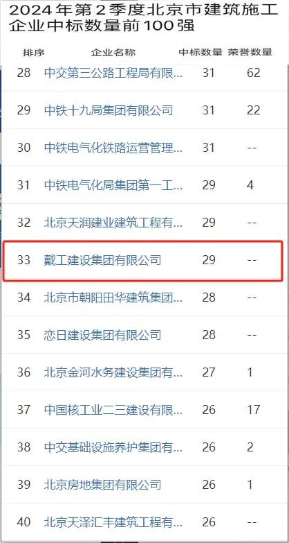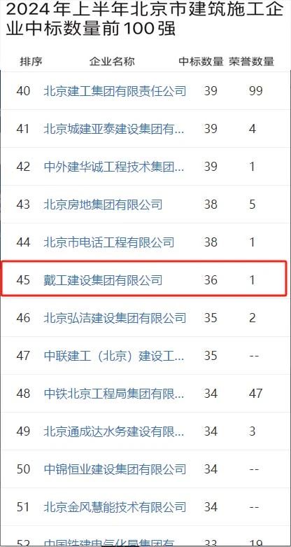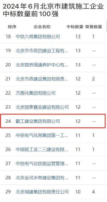 時間推進(jìn)到2024年6月,戴工集團(tuán)更是迎來了單月的高光時刻。在這個關(guān)鍵月份,戴工集團(tuán)憑借出色的項目策劃和執(zhí)行能力,一舉將排名提升至北京市建筑施工企業(yè)中標(biāo)數(shù)量前100強(qiáng)的第24位。這一成績的取得,充分展示了戴工集團(tuán)在短期內(nèi)的快速響應(yīng)能力和高效執(zhí)行力,也為其在市場上的進(jìn)一步拓展奠定了堅實基礎(chǔ)。