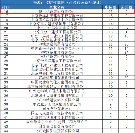 近日,CBI建筑網發布的2024年7月北京建筑施工企業中標數量排行榜中,戴工建設集團有限公司以卓越的市場表現與項目實力,強勢躋身前十六強,彰顯了其作為行業領軍企業的深厚底蘊與強勁發展勢頭。