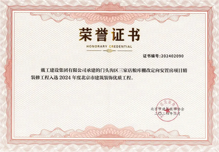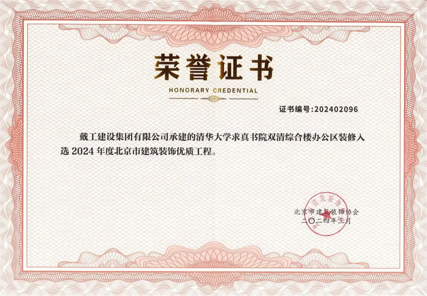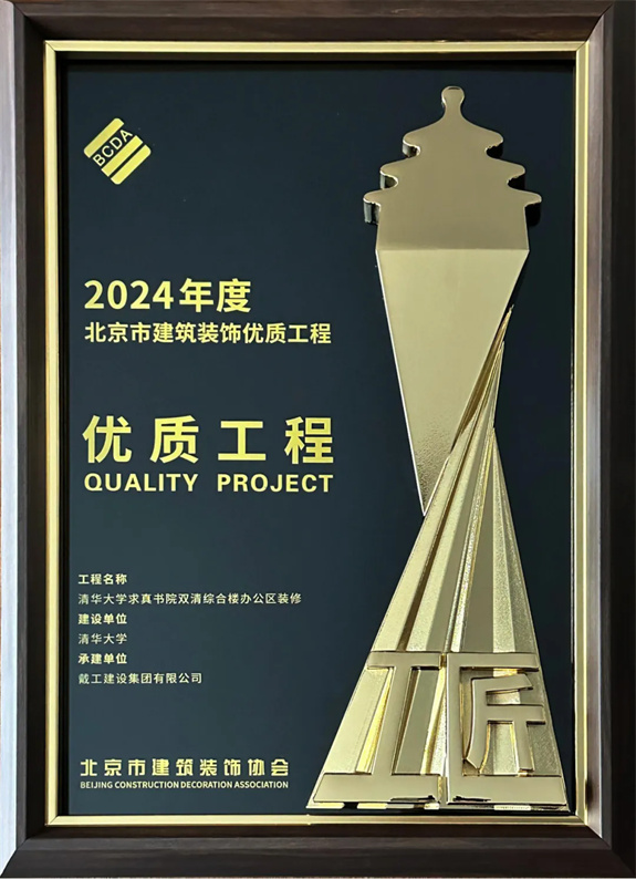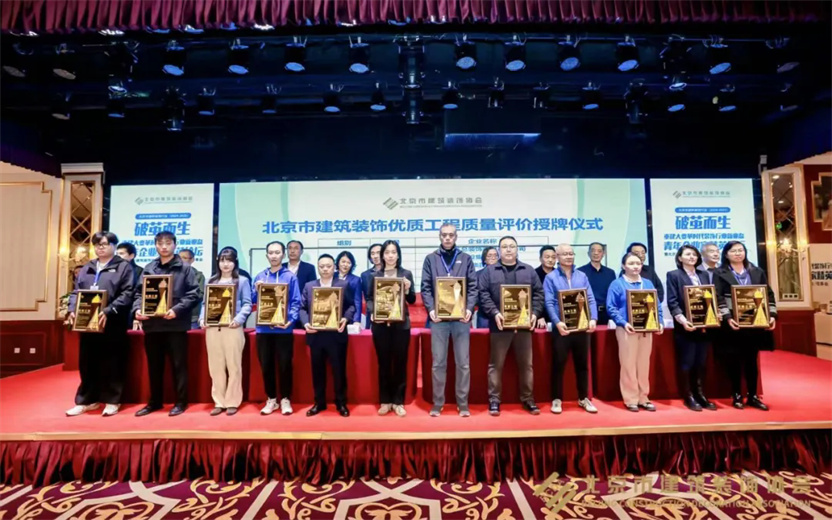 同時,2023-2024年度北京市建筑裝飾優質工程質量評價結果及施工組織設計競賽也在會議中公布,戴工集團憑借精湛的施工工藝和嚴格的品質把控,所承建的“門頭溝三家店糧庫棚改定向安置房項目精裝工程”以及“清華大學求真書院雙清綜合樓辦公區裝修項目”均獲得2024年度北京市建筑裝飾優秀工程獎!