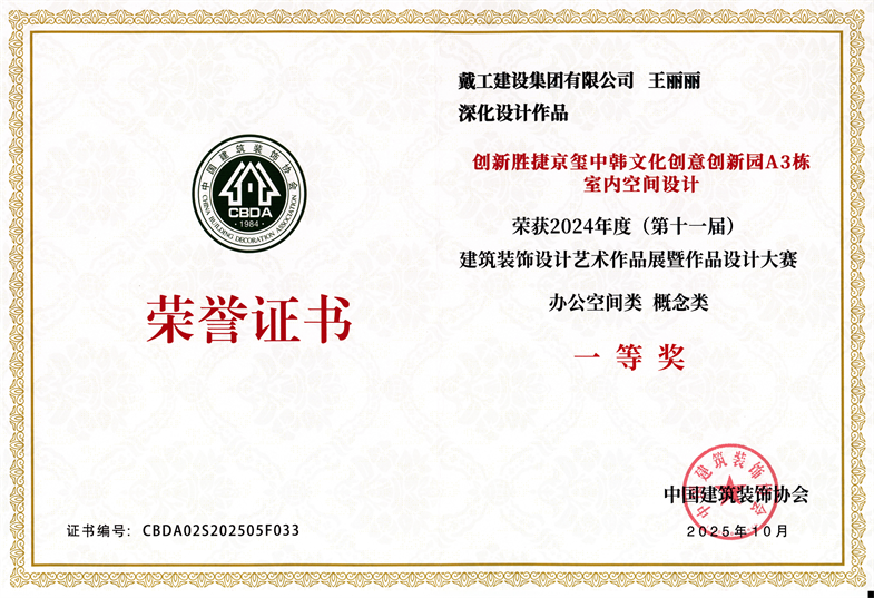 榮譽加身,砥礪前行。未來,戴工建設集團將以此次獲獎為契機,繼續深耕建筑裝飾領域,持續激發設計創新活力,提升工程施工品質,為客戶打造更多兼具功能性與藝術性的優質項目,為推動建筑裝飾行業的高質量發展貢獻力量!